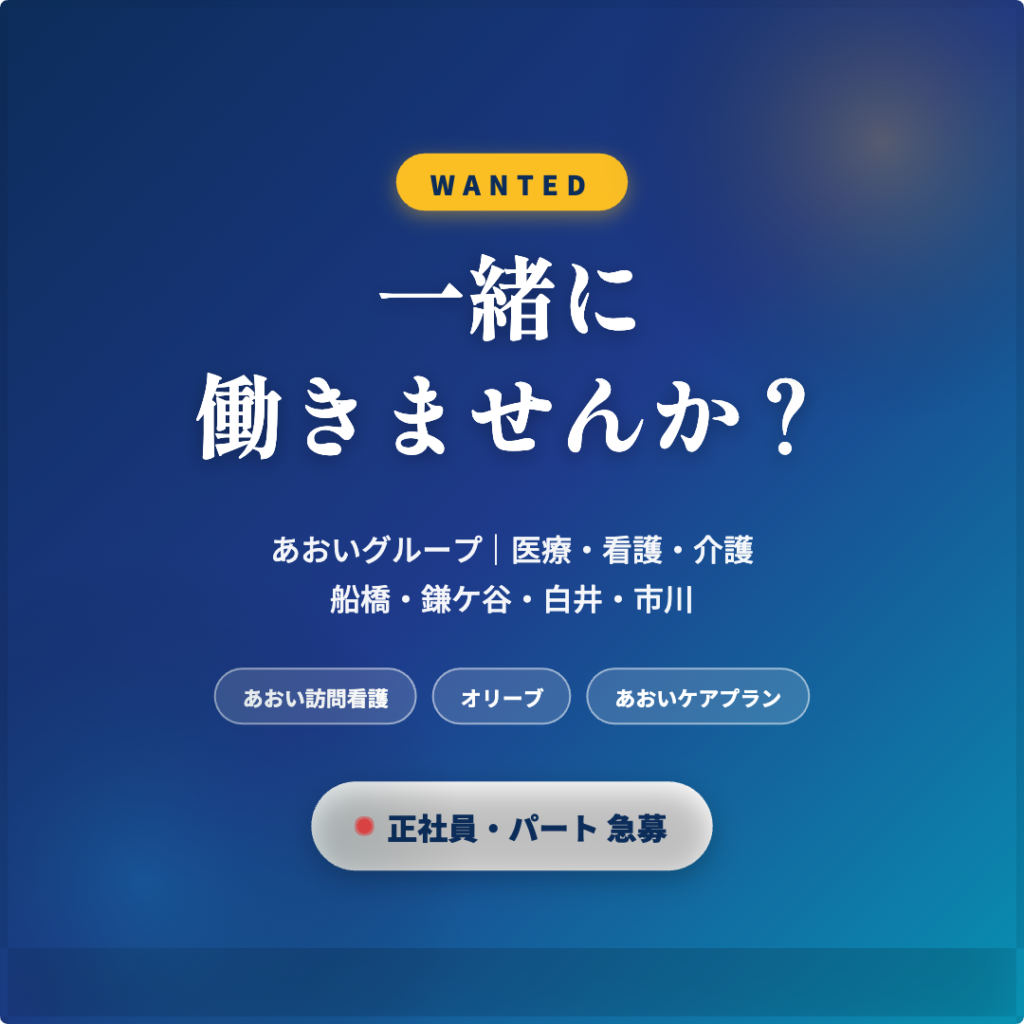 船橋市、市川市、鎌ケ谷市、白井市で訪問看護サービスをお探しの方へ。あおい訪問看護ステーションが、地域密着のケアでお手伝いします。ご自宅で安心な生活を実現するために、私たちがサポートします。
