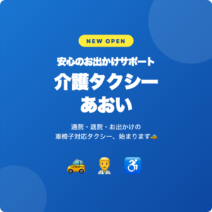 通院や外出時の送迎は「あおい介護タクシー」がサポート。車椅子・ストレッチャー対応で、移動の不安を解消します。