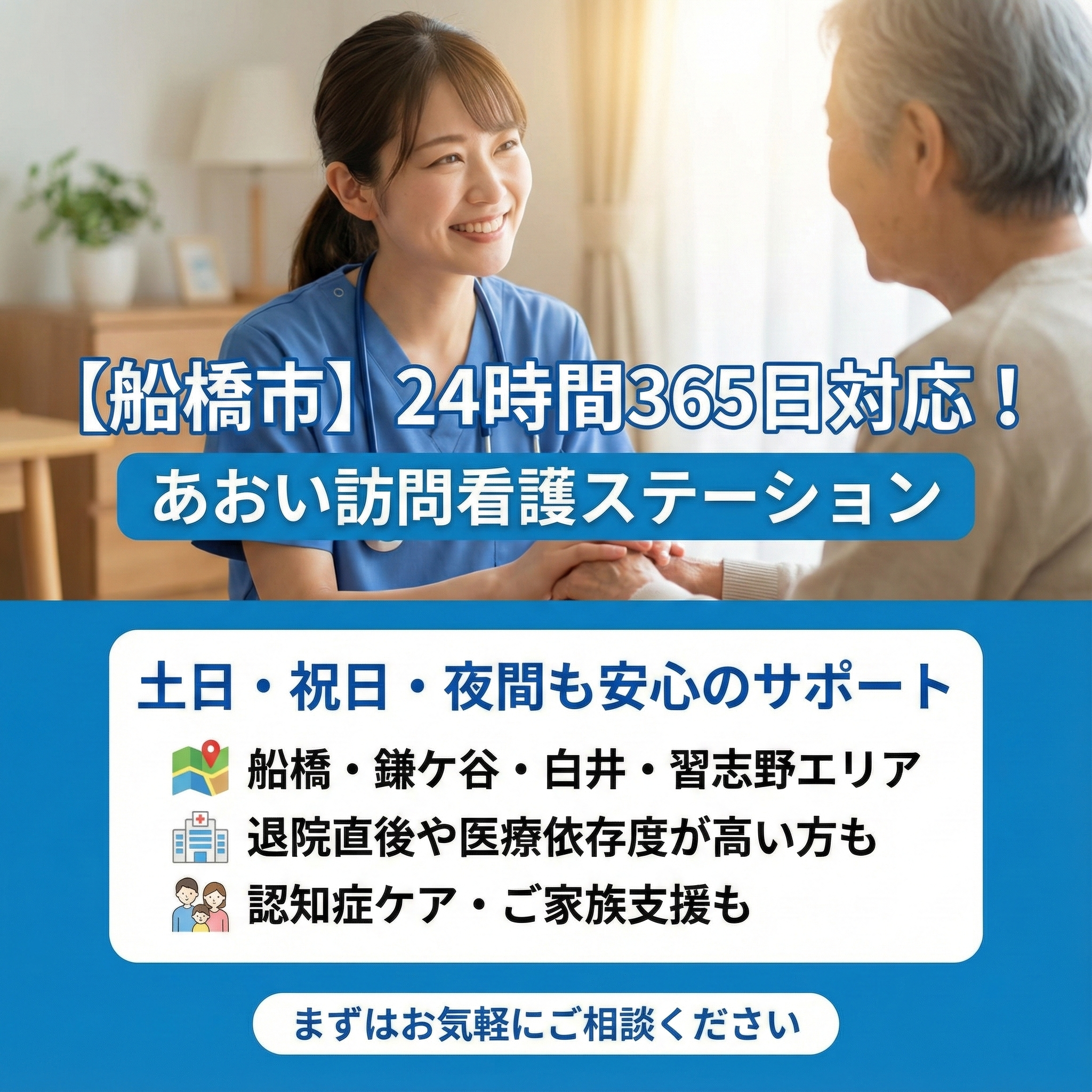 「明日退院だけど、訪問看護どうしよう…」そんな声をよく耳にします。 あおい訪問看護ステーションでは、船橋市・鎌ケ谷市・白井市・市川市エリアを中心に、24時間365日対応の体制を整えています。急な退院や夜間・休日のご依頼にも、経験豊富な看護師が迅速に対応いたします。