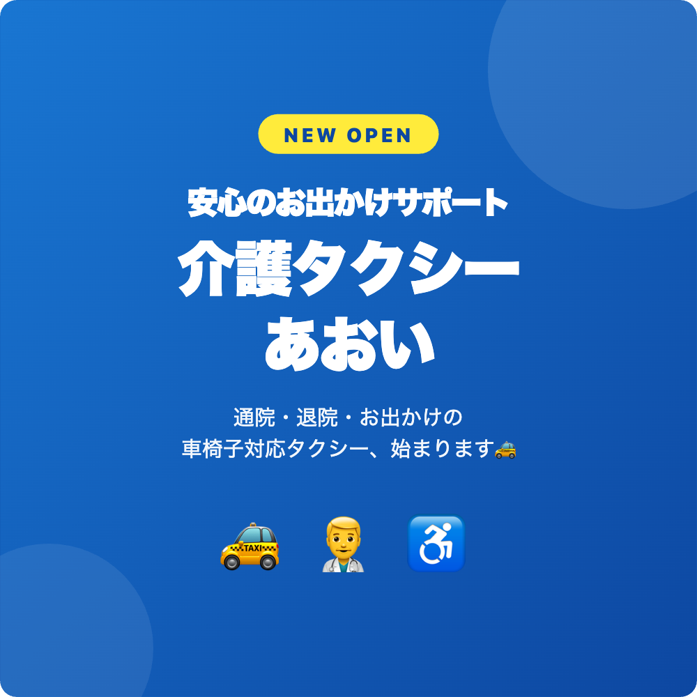 当社はすでにあおい訪問看護ステーション(船橋市)、あおいケアプランセンター(船橋市)、ヘルパーセンターオリーブ(鎌ケ谷市)を運営しており、介護タクシーあおいはこれらの事業と連携しながら、地域の皆様の在宅生活をより充実したものにするためのサービスとして立ち上げました。